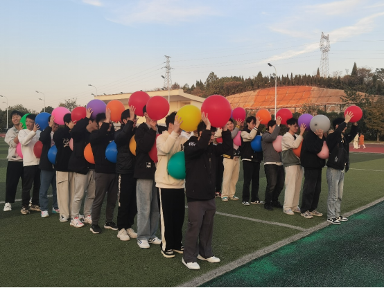 在此期间,也组织了附加趣味游戏--心心相印。具体活动规则如下:前后队员之间夹住一个气球,每人手举一个气球,最后一名队员过线时结束,按用时长短进行排名,给每支队伍增加积分。若中途气球掉下,则须返回重新开始,只有一次机会,赛程为30米。