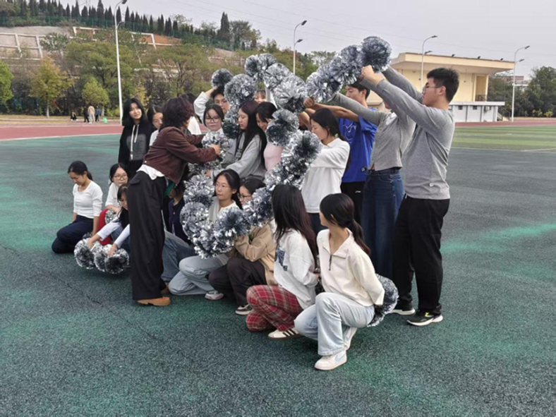 啦啦操训练区专注有序。肖柳口令清晰、节奏分明,不断纠正动作。同学们心领神会,反复练习,力求每一个动作都整齐有力、流畅舒展。每一次挥臂、每一次转身,都凝聚着他们对完美呈现的执着追求,同学们正用青春的活力与动感的舞姿,为运动会营造热烈氛围。