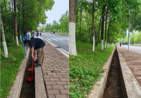 公共区域的清扫工作覆盖了从逸夫楼到校门右侧的路段。路边草坪上的塑料垃圾被仔细捡起,水渠里的落叶和垃圾也被扫把和垃圾铲清理干净。