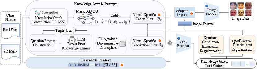 高质量的三维面具在外观与结构上高度逼真,极易被人脸识别系统误判为真实人脸。三维面具呈现攻击检测旨在区分真实人脸与仿真面具,是防范三维面具犯罪的关键技术。现有方法多依赖多模态图像或rPPG特征,深受多模态传感器成本高、泛化能力弱、可解释性差等问题的困扰。针对这些问题,该研究提出了一种知识与数据双驱动的检测新范式,将专家知识与因果推断融入提示学习,消除图像与文本提示间的虚假关联,生成显式、细粒度且具备上下文依赖性的因果提示,通过充分迁移视觉语言模型的通用知识来实现真实人脸与三维面具的精准鉴别。该方法仅依赖常规可见光摄像头,在多个复杂开放场景中对已知与未知三维面具攻击均取得了当前最优的检测性能,并为模型决策提供了更直观的语义解释。