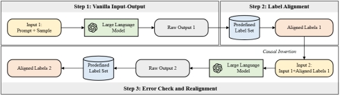 研究团队利用因果推断中的因果干预和反事实技术有效减少大语言模型输出中的幻觉问题,通过双重对齐和错误检查机制实现了大语言模型在动态标签集上的高效适配(图2),显著提升了大语言模型在大规模多标签分类任务、动态标签集合场景下的性能。