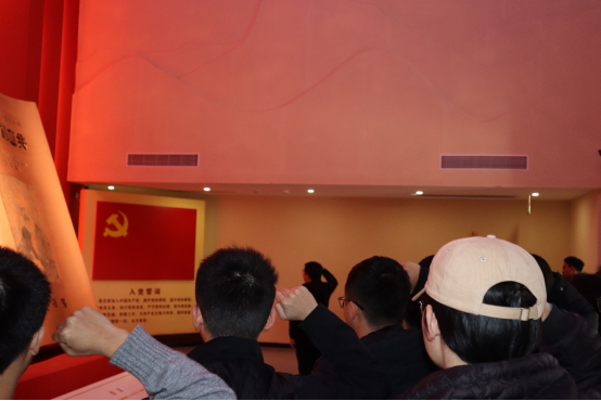 随后,全体人员步入党史馆展厅。在鲜红的党旗下,陈杰烜老师带领预备党员们庄严宣誓。他们郑重举起右拳,齐声宣读入党誓词:“我志愿加入中国共产党,拥护党的纲领,遵守党的章程……”铿锵有力的誓言在展厅内回荡,彰显出预备党员们对党的无限忠诚和坚定信念。